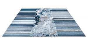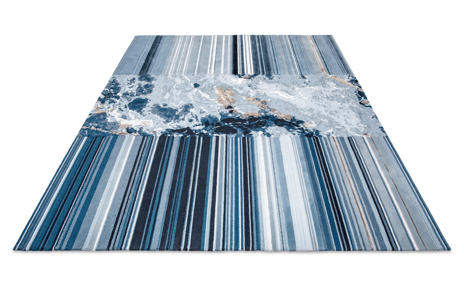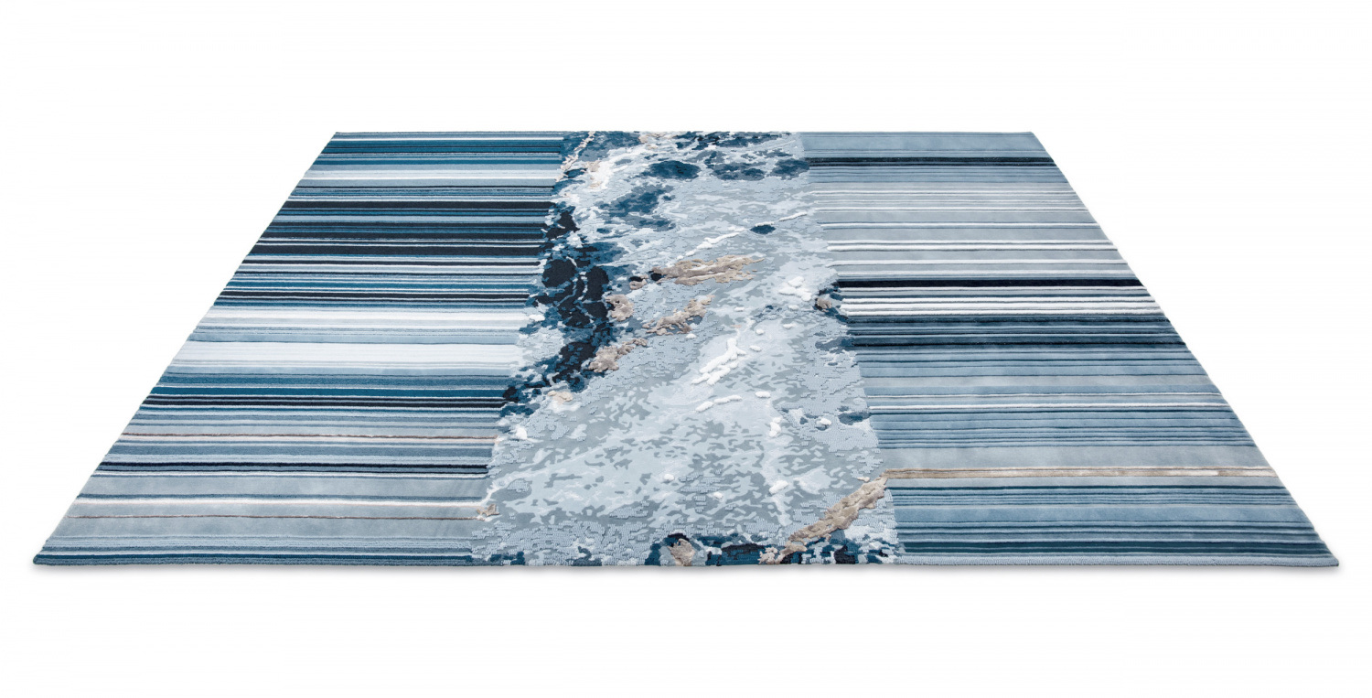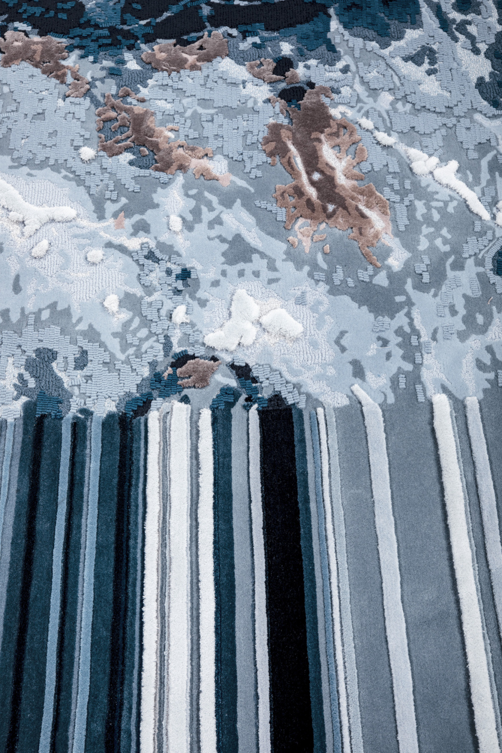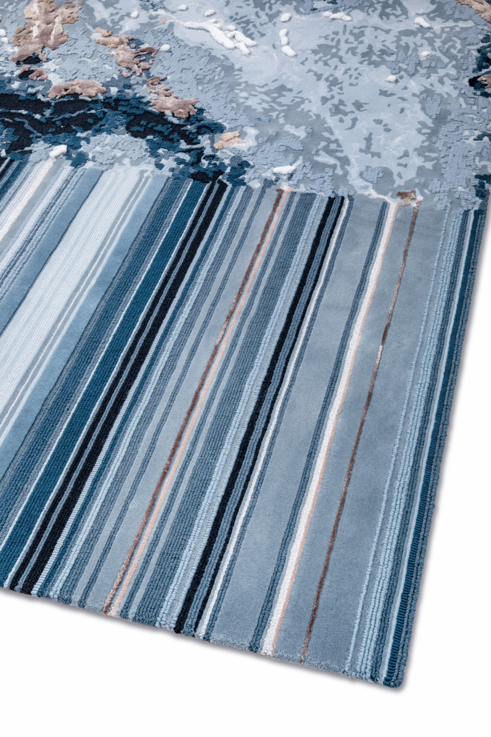 Crafted in cool blue shades, Ionic I focuses in the middle texture with elongated lines at the two sides to create an expansive view. With intricate juxtaposition of wool lacet and silk patches, the rug is a rich and timeless piece masterpiece.