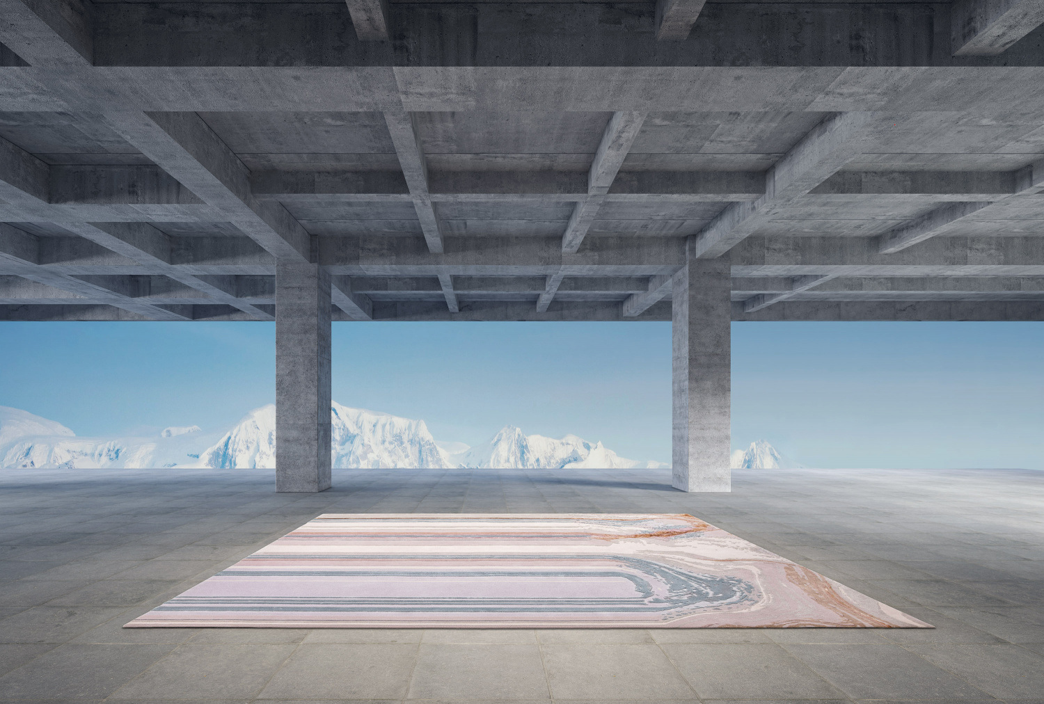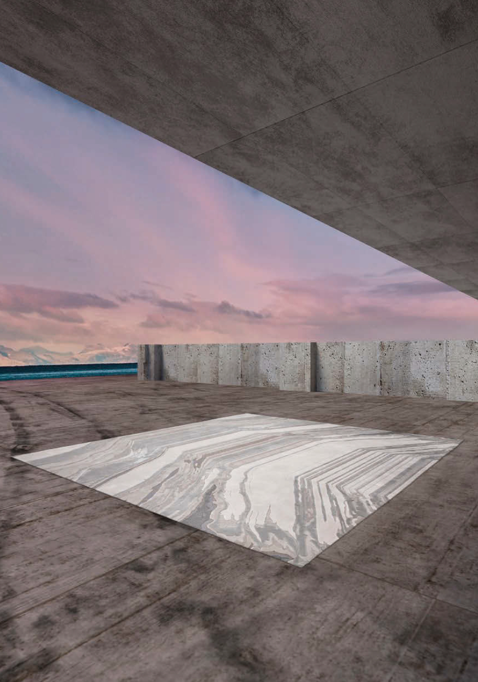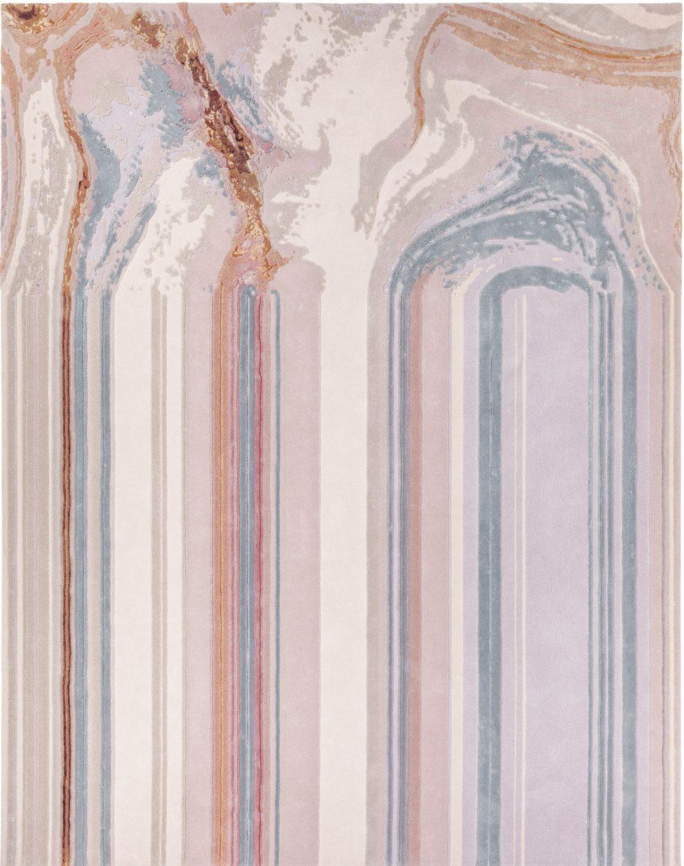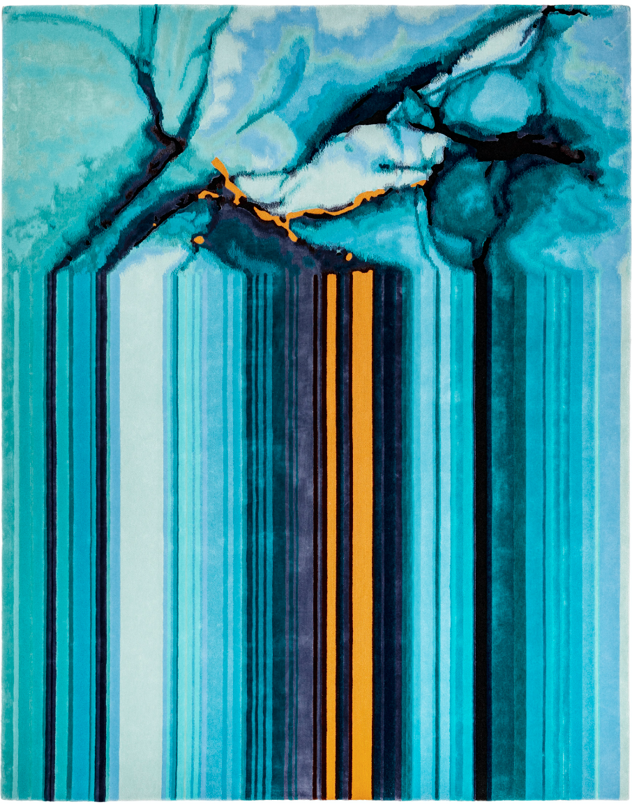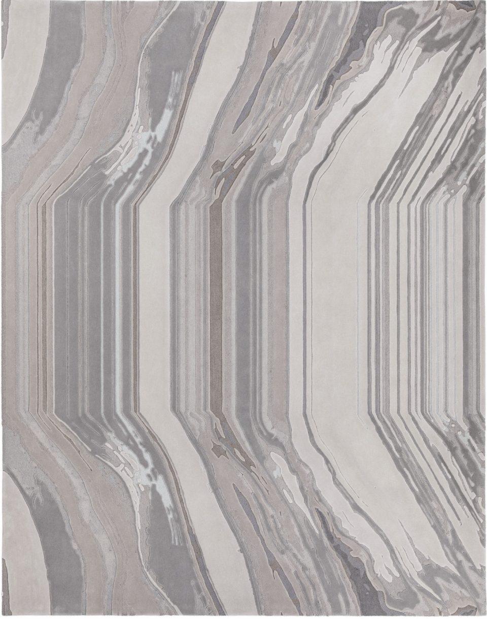 Crafted in cool blue shades, Ionic I focuses in the middle texture with elongated lines at the two sides to create an expansive view. With intricate juxtaposition of wool lacet and silk patches, the rug is a rich and timeless piece masterpiece.