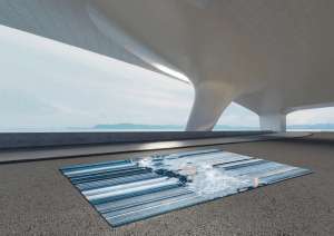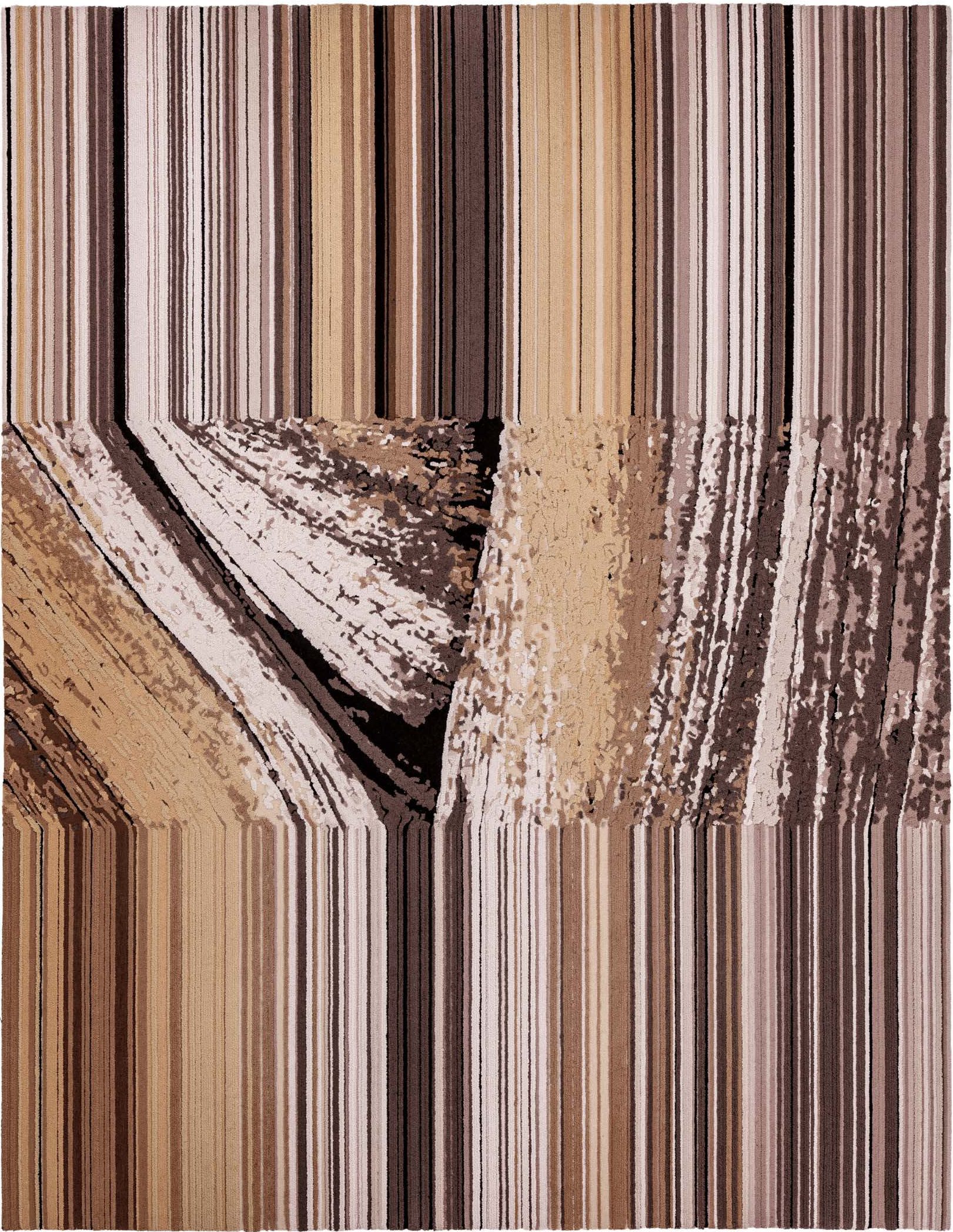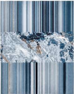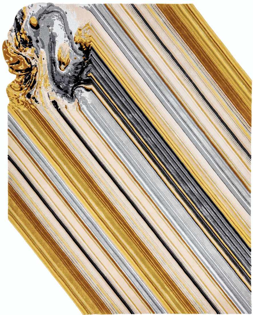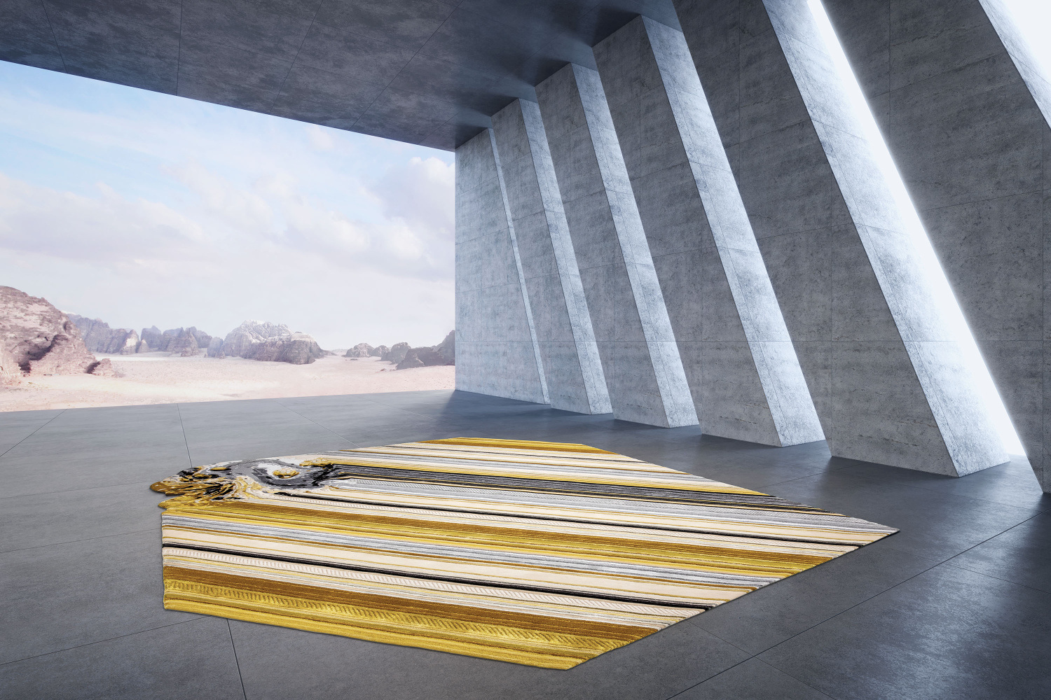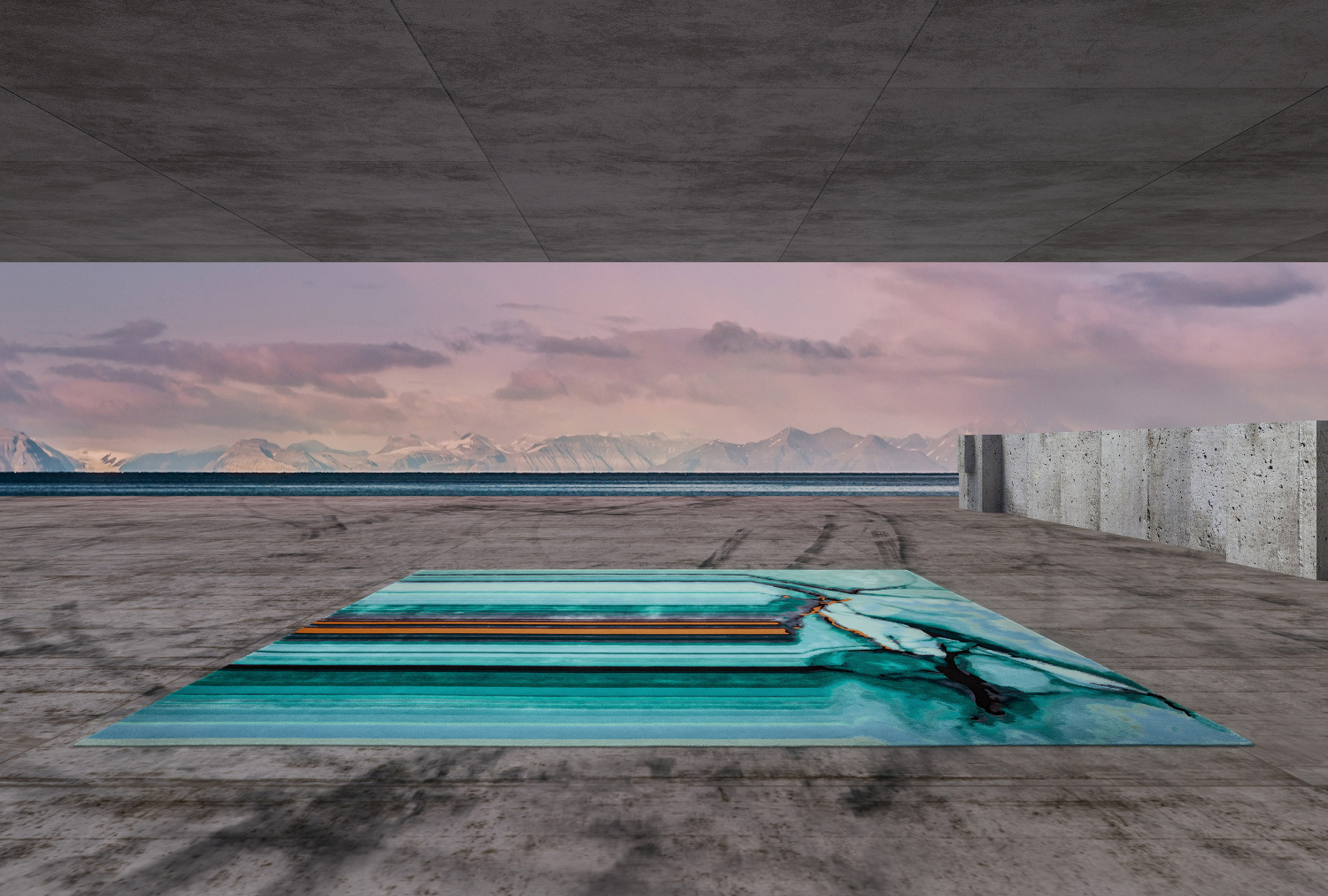 Crafted in cool blue shades, Ionic I focuses in the middle texture with elongated lines at the two sides to create an expansive view. With intricate juxtaposition of wool lacet and silk patches, the rug is a rich and timeless piece masterpiece.
